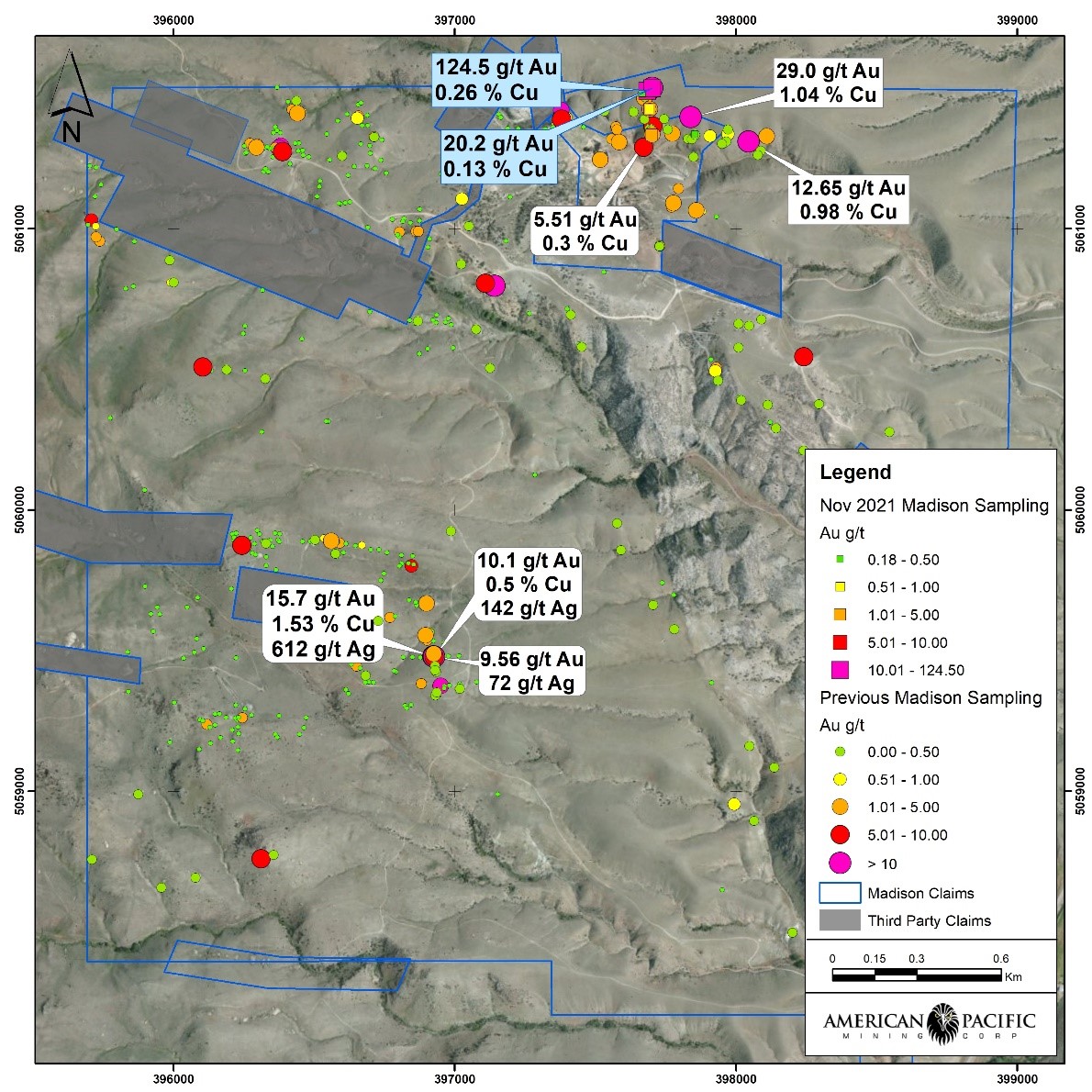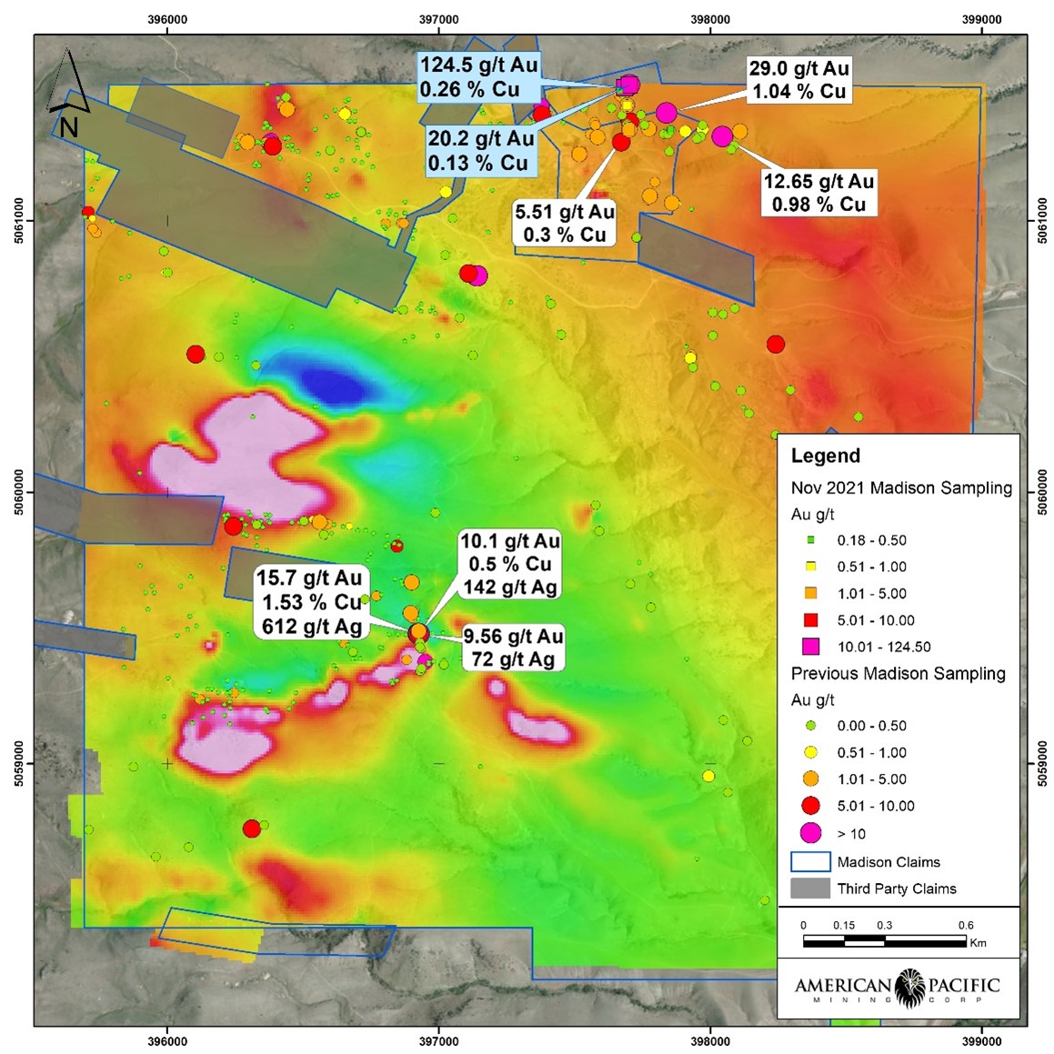 American Pacific Mining President, Eric Saderholm, stated: “We are very pleased with the results of this exceptional quality magnetic survey and the expanding exploration targets that are developing at Madison as a result. The newly defined magnetic high anomalies are much more pronounced than expected and are interpreted by American Pacific geologists as the late-stage intrusions that are essential to any copper-gold porphyry and skarn system. These anomalies are often responsible for the strongest gold and copper mineralization in these types of systems and the number of untested targets generated by this survey is suggestive of property-wide exploration upsides remaining at Madison.”